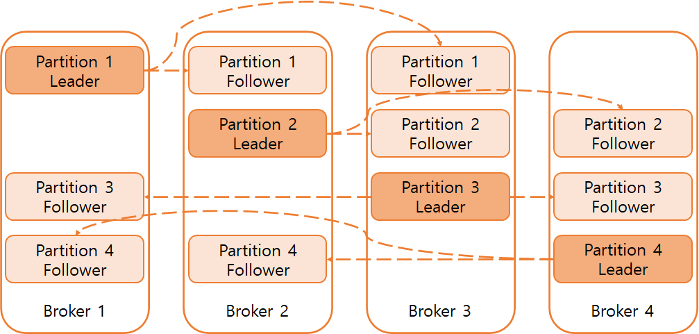 Follower replica는 Leader replica의 데이터를 복제하여 동일하게 유지하다가 Leader replica가 중단되는 경우 Follower replica 중 하나가 해당 Partition의 새로운 Leader replica로 선출됩니다.