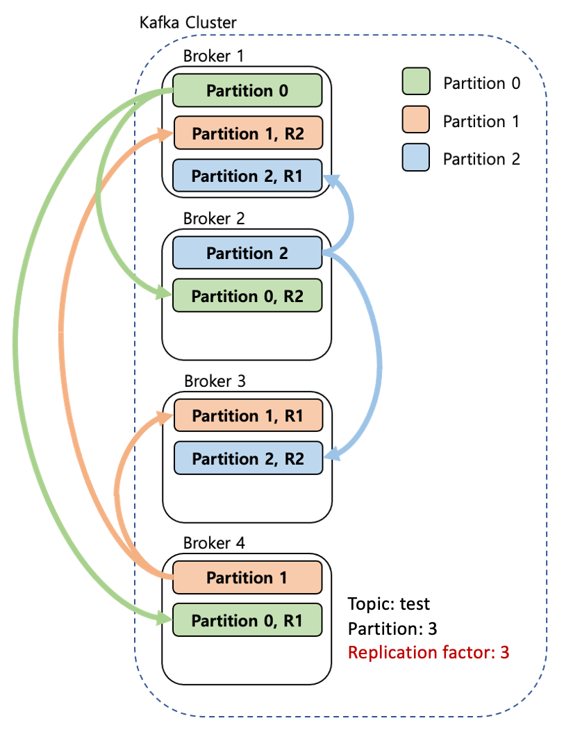 Topic 단위로 replication factor를 설정한다 해서 Topic을 replication 하는 것이 아니라, Topic을 이루는 각각의 Partition을 replication 하는 것입니다.